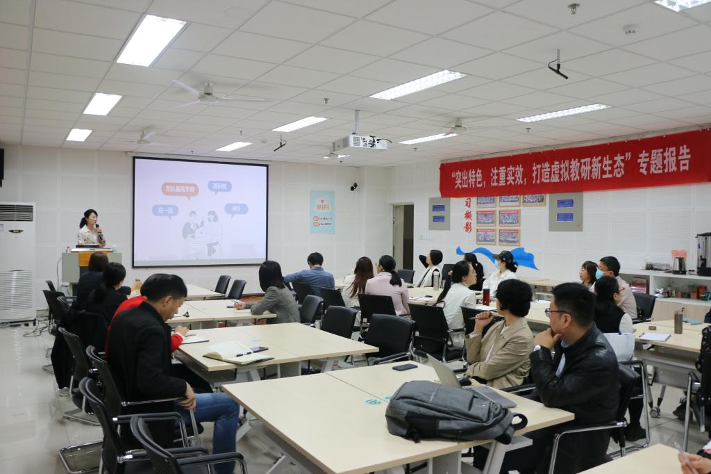 教师发展中心举办“突出特色,注重实效,打造虚拟教研新生态” 专题报告 2023-04-18为进一步加强我校教师对虚拟教研室的了解,促进学校探索以虚拟教研室为代表的新型基层教学组织的建设标准与路径,4月18日,教师发展中心特邀教育部院校评估专家、首批国家级虚拟教研室负责人杜湘瑜教授举办“突出特色,注重实效,打造虚拟教研新生态”专题报告。活动由教师发展中心主任张晓霞主持。杜湘瑜教授首先向大家简要介绍了国防科技大学的基本情况。随后向大家专题介绍了虚拟教研室的内涵和特点、虚拟教研室建设的目标... -