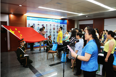 首先举行的是新入职教师入职宣誓仪式。在国旗前,由化学化工学院院长、第四届国家级教学名师魏琴教授领誓,全体新入职教师高举右手,面向国旗,庄严宣誓。新教师代表郇宇、老教师代表王琦教授分别做了发言。