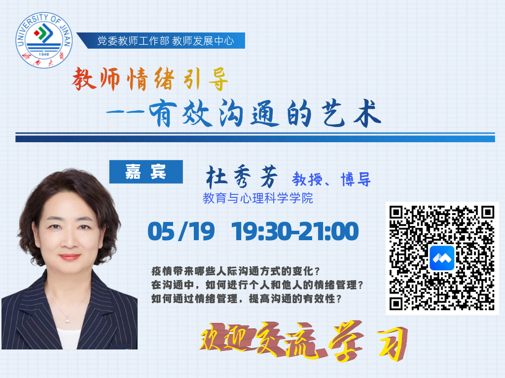 为帮助教师做好情绪管理,提升人际关系,营造和谐氛围,涵养师德师风,以良好的情绪状态投入工作生活,党委教师工作部、教师发展中心联合教育与心理科学学院举办“教师情绪引导——有效沟通的艺术”主题讲座。 欢迎老师们交流学习! 一、讲座主题 教师情绪引导——有效沟通的艺术 二、讲座嘉宾 杜秀芳,教育与心理科学学院教授,博士生导师。 兼任山东省社会心理学会副会长。主要从事行为决策、心理健康教育等领域的研究,主持国家社科基金、教育部人文社科规划项目等多项科研课题,在国内外专业核心期刊发表论文70余篇。 三、举办时间 5月19日(周四)19:30-21:00 四、内容简介 结合疫情防控背景,分析阐释人际关系沟通、师生沟通、亲子沟通、自我情绪管理、对他人情绪管理等的具体方法和技术,以及如何通过情绪管理提高沟通的有效性。 五、收看说明 1.直播平台:腾讯会议 2.收看方式(以下任选其一): (1)腾讯会议号:159 562 595 (2)直播链接:https://meeting.tencent.com/dm/y8rW8nN8kEIb (3)微信、腾讯会议扫描海报中的二维码